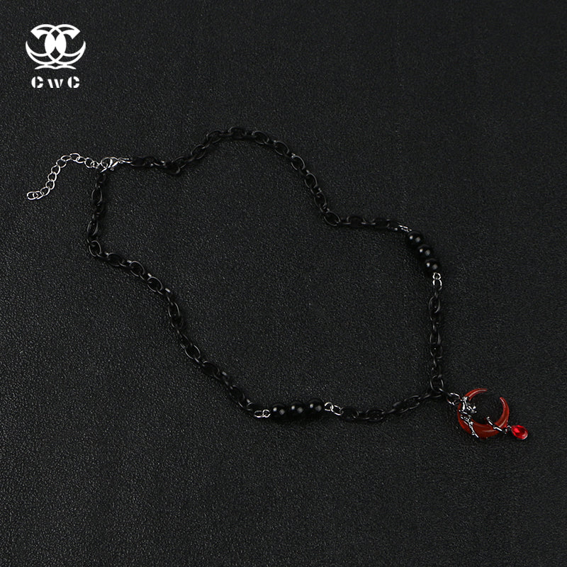 Set on a black alloy chain with polished beads, the piece delivers dramatic, otherworldly energy perfect for gothic fashion, occult aesthetics, and vampire-core style.