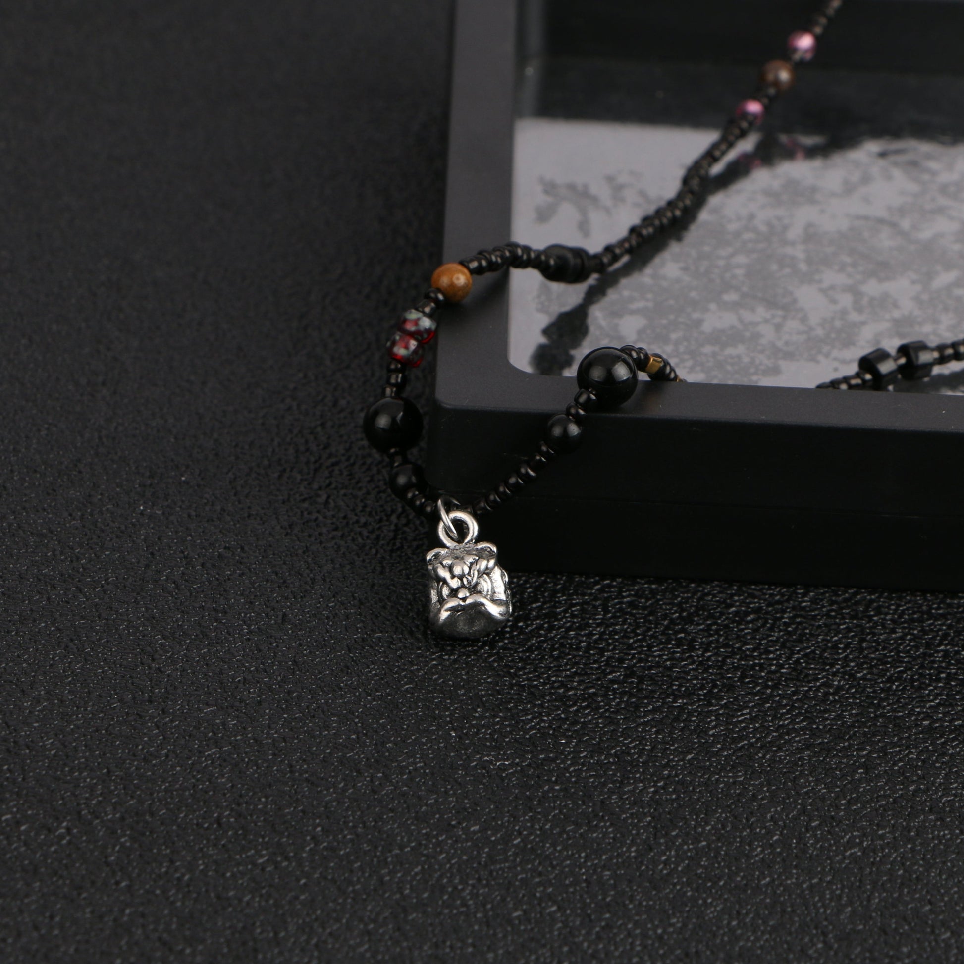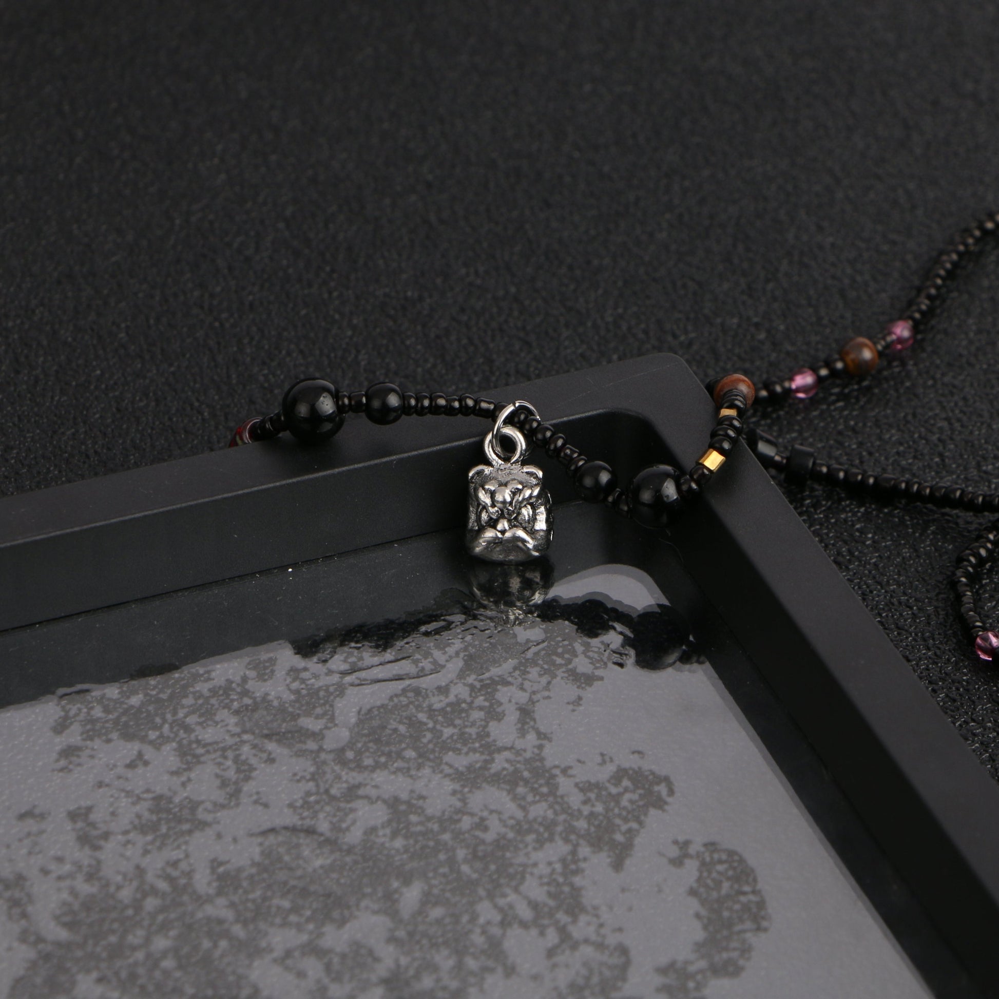 A unique and protective accessory crafted from premium titanium steel. This necklace features a detailed pendant resembling a fierce guardian spirit, symbolizing strength and protection. The pendant hangs from a strand of intricately beaded black and accented stones, adding a touch of mystery and depth to the design. The titanium steel construction ensures exceptional durability and resistance to tarnish, making it perfect for everyday wear.