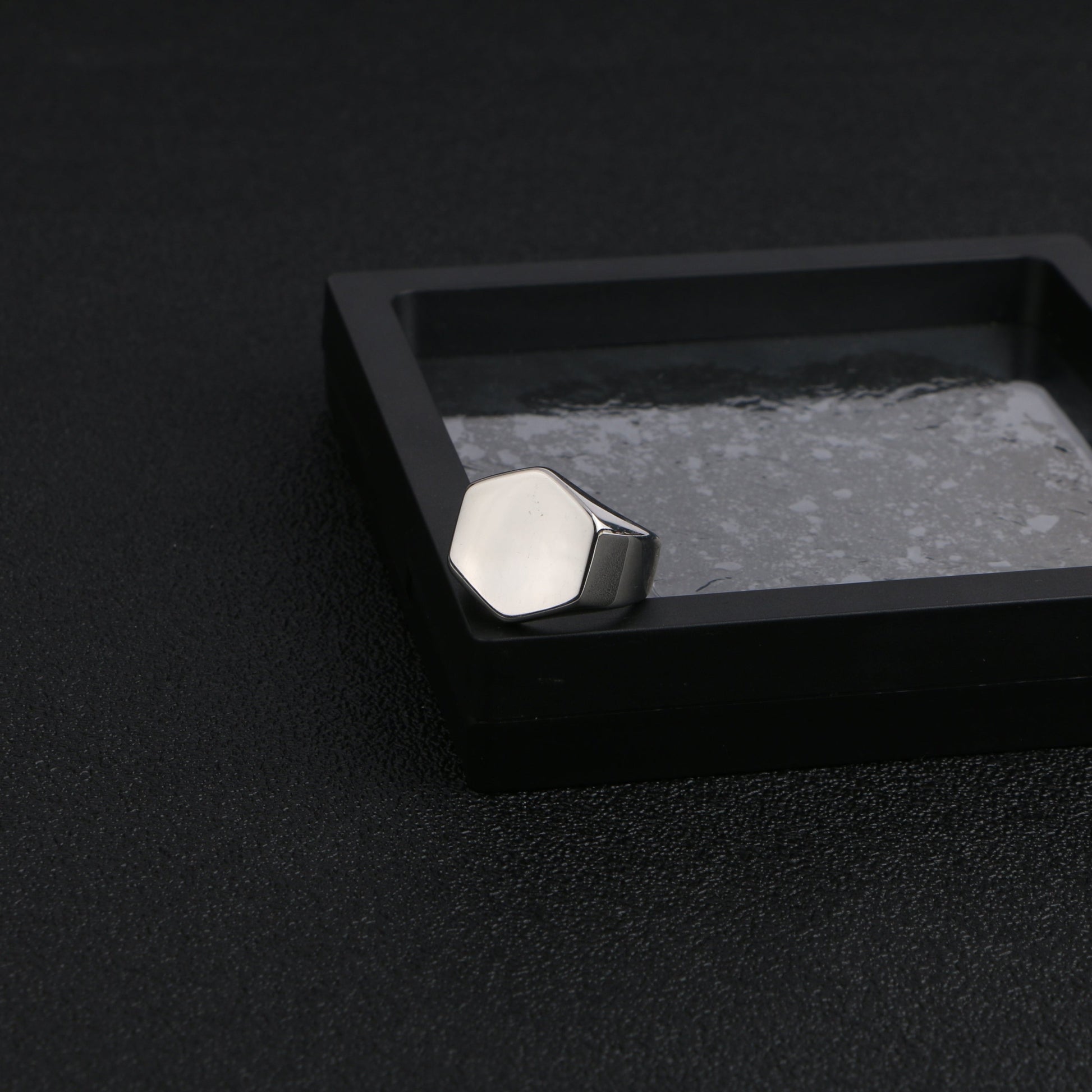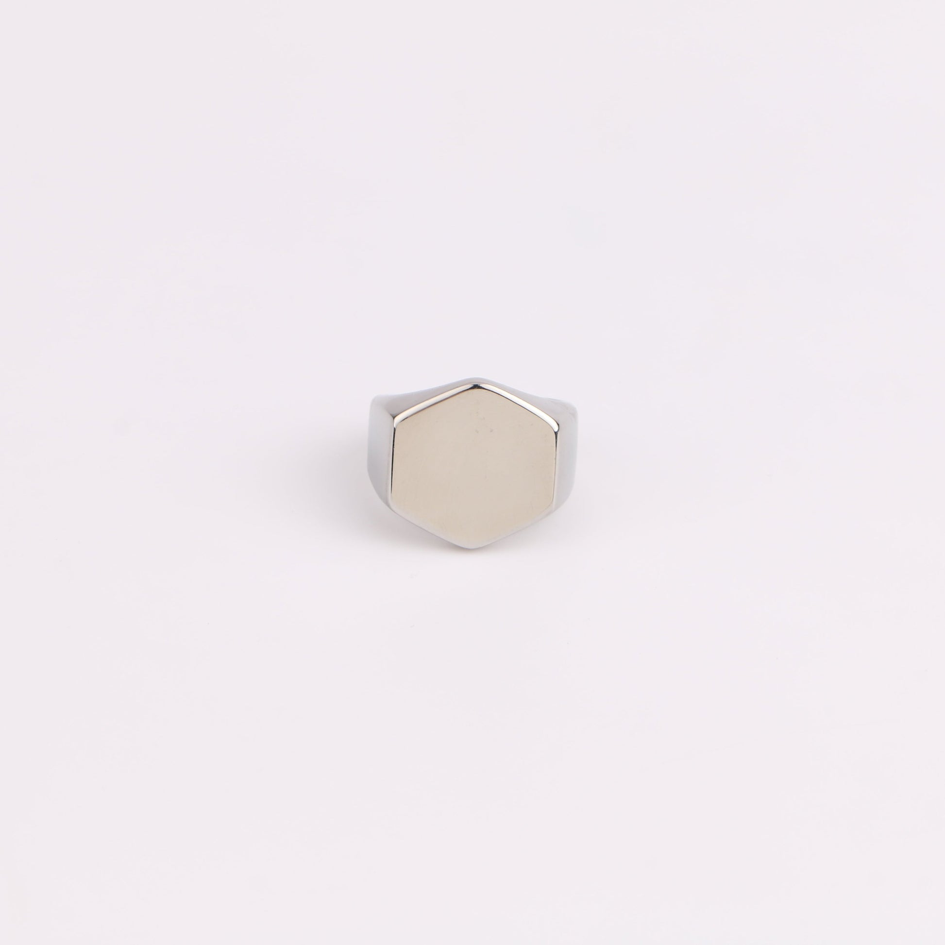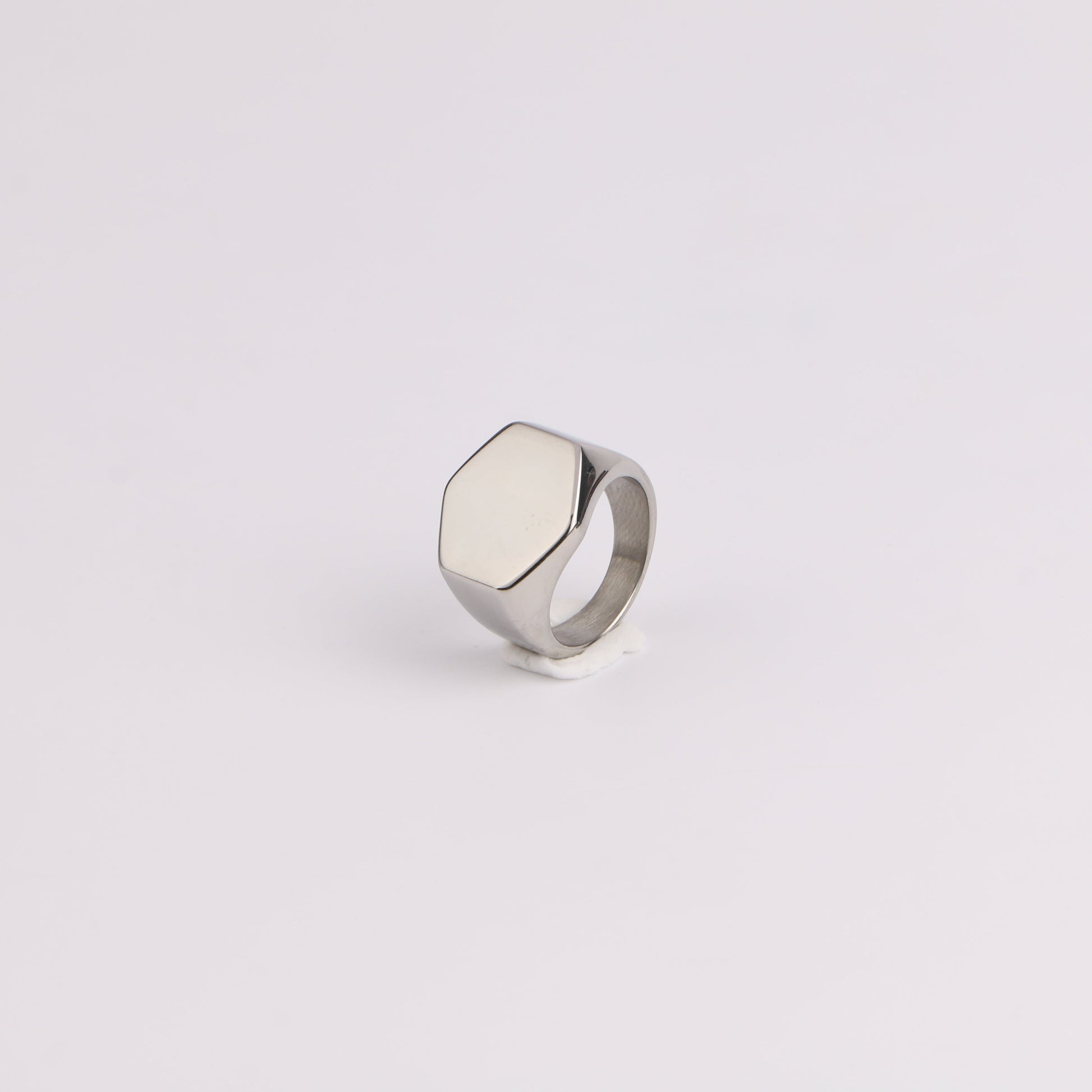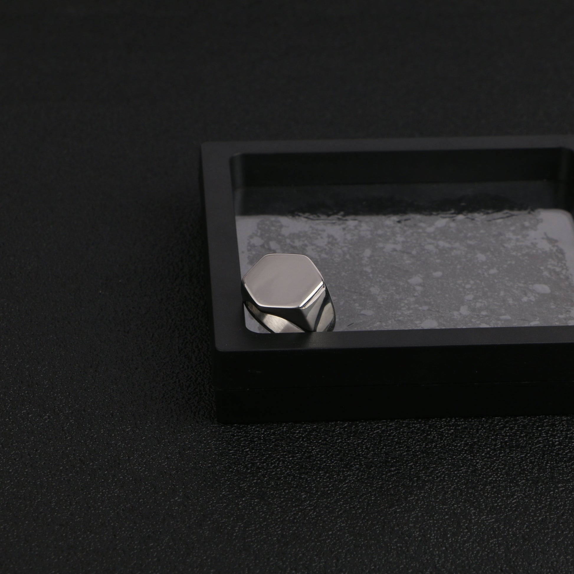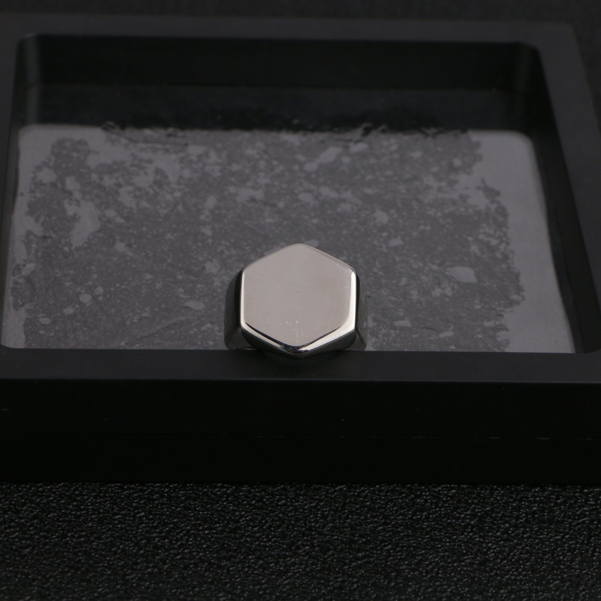 A distinctive piece crafted from premium titanium steel. This ring features a unique hexagonal face with a sleek, polished finish, offering a modern and geometric aesthetic. The robust titanium steel construction ensures exceptional durability and resistance to tarnish, making it ideal for everyday wear.