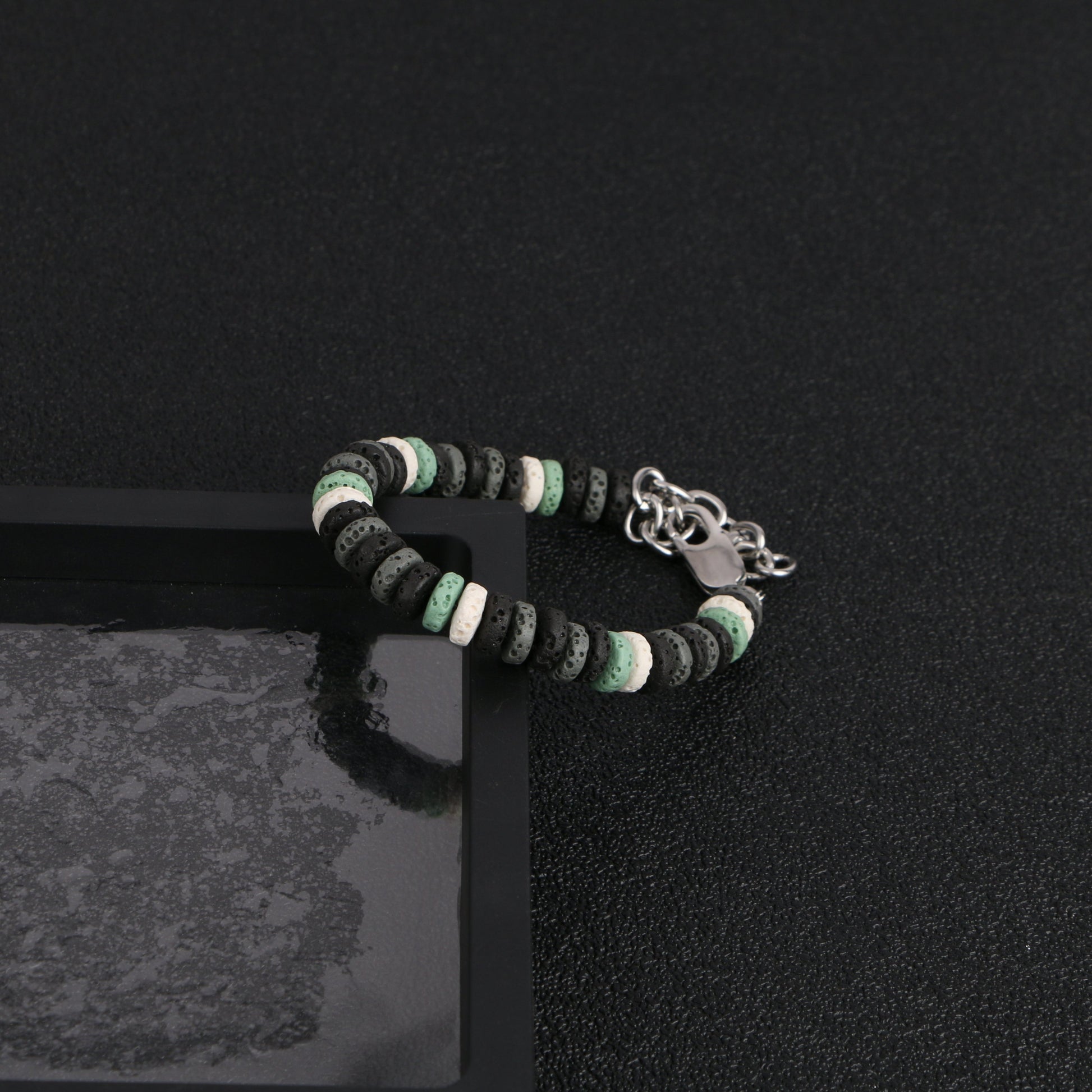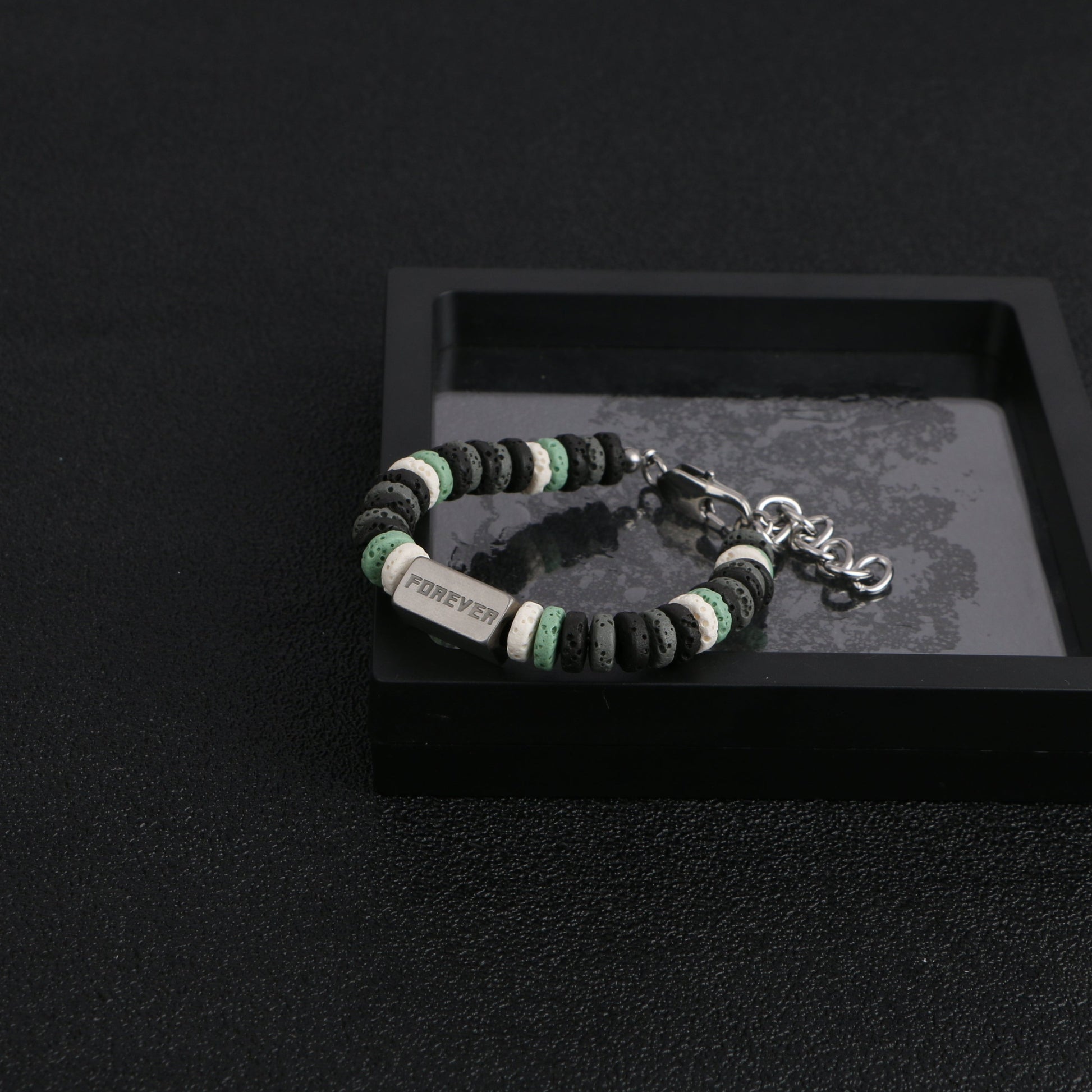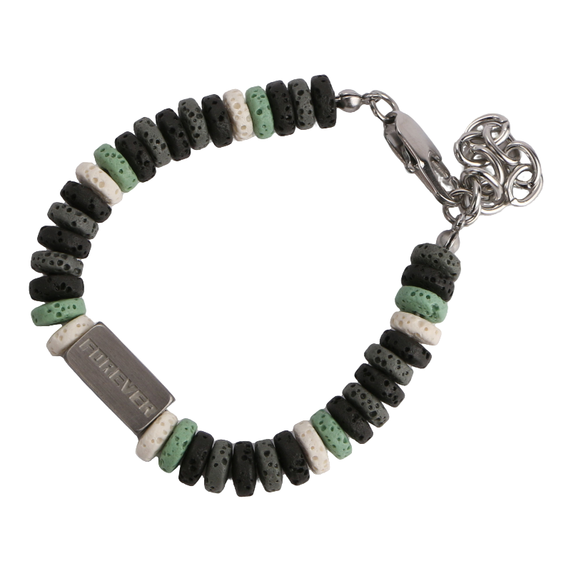 Embrace the natural beauty and grounding energy of the Lava Stone Bracelet, a unique accessory crafted from genuine lava stones. this bracelet features porous lava beads that are lightweight and comfortable to wear, making it perfect for everyday use. The lava stones, known for their earthy texture and grounding properties, are complemented by a central engraved plate with the word "FOREVER," symbolizing enduring strength and commitment. Measuring 8.3 inches in length.