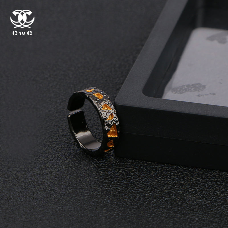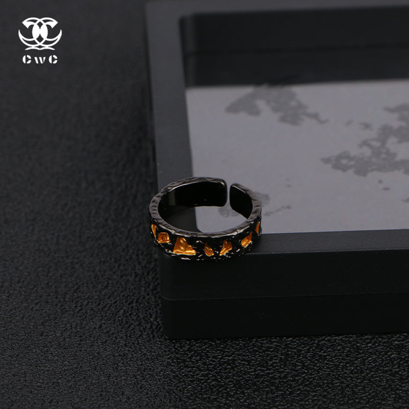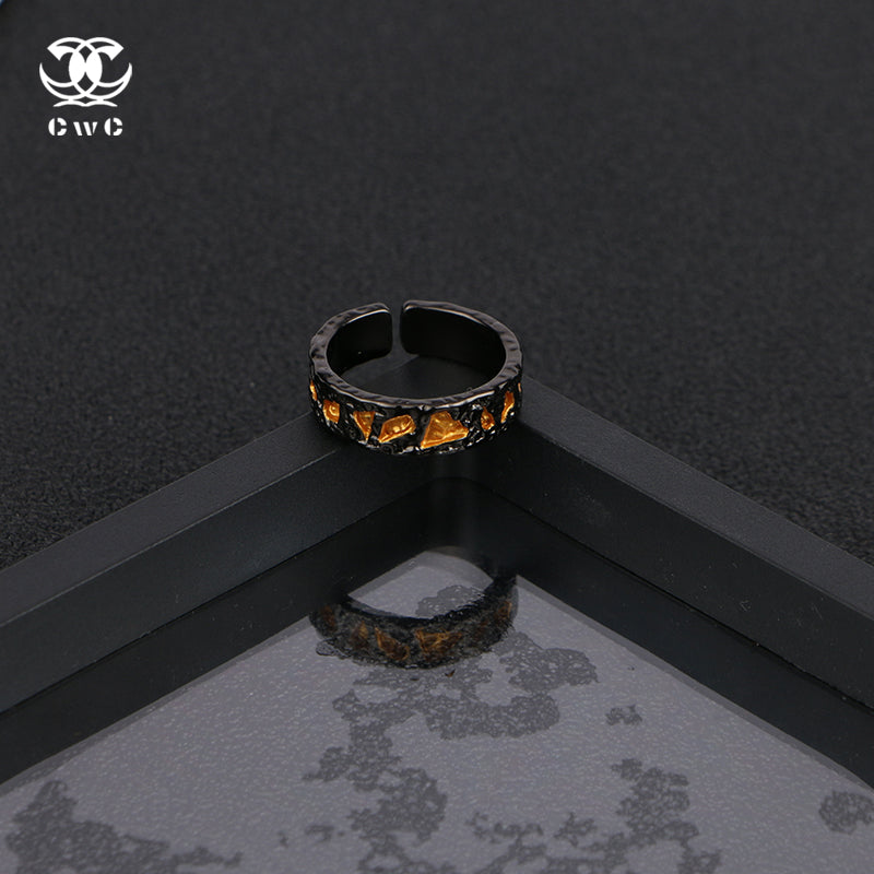 The Obsidian Ember Ring is a bold and captivating piece that exudes mystery and power. Crafted from a black metal base with a rugged, hammered texture, the ring is adorned with golden, molten-like accents embedded along its surface, resembling fiery embers glowing within volcanic rock.