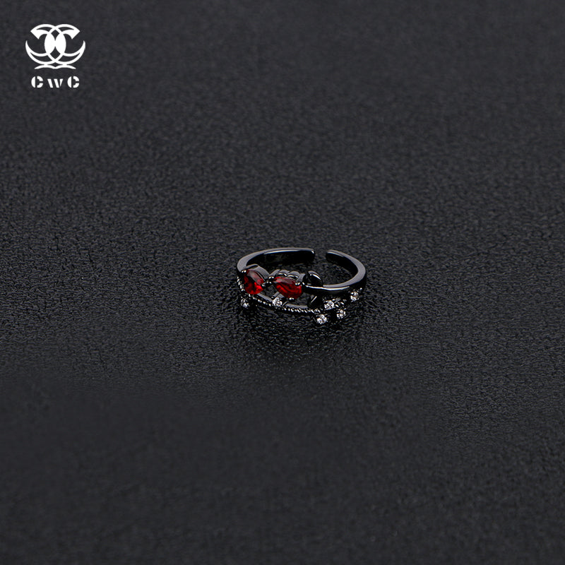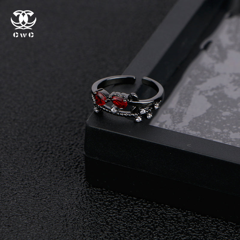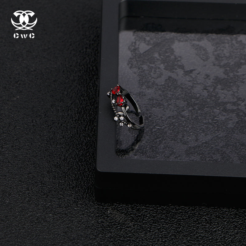 The Obsidian Rose Ring is a mesmerizing fusion of dark elegance and fiery passion, designed for those who embrace mystery and allure. Crafted from black-toned metal, the ring features a delicate yet bold floral-inspired motif, with intertwining vines that cradle two deep crimson gemstones in a striking symmetrical design. The contrast between the rich red stones and the dark metal setting creates a dramatic and captivating effect, evoking the image of a rose blooming under the moonlight.