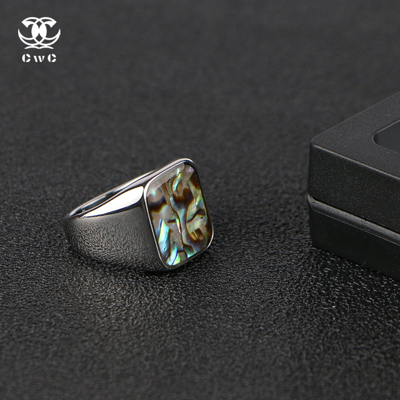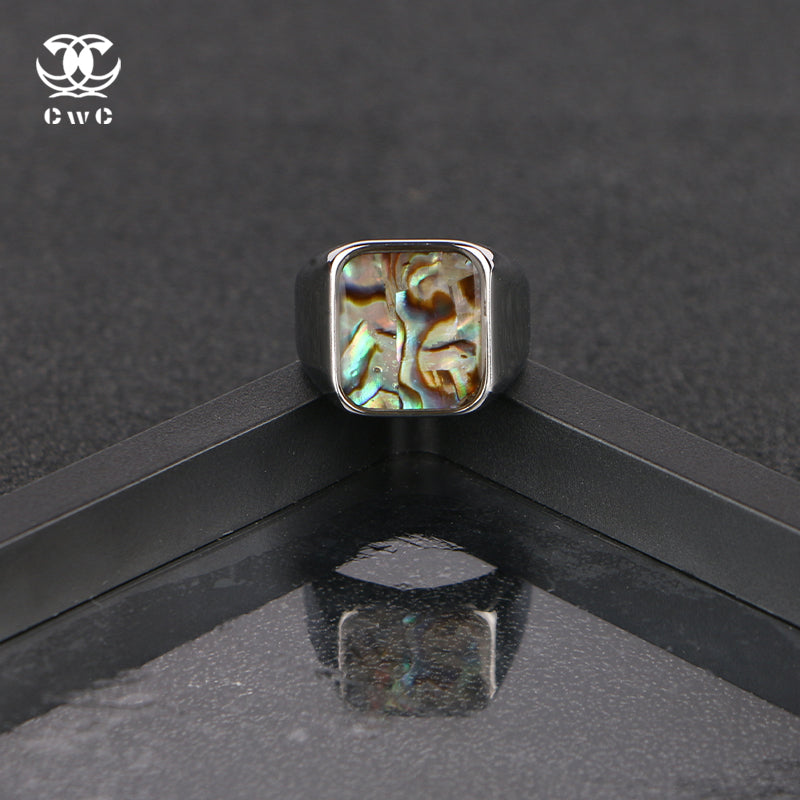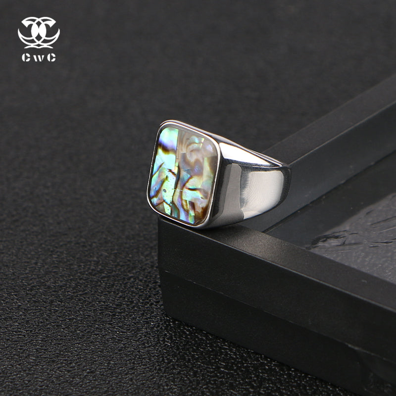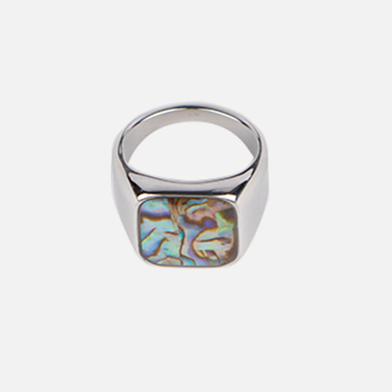 Bold meets fluid in the Ocean Mirror Signet, a statement ring crowned with iridescent abalone shell. Its square face gleams with oceanic hues — shimmering blues, greens, purples, and golds — like sunlight rippling across the sea floor. Set in a sleek, high-shine silver-tone frame, this piece captures the balance between natural beauty and modern edge. Whether paired with clean fits or layered jewelry, it brings effortless cool with every flick of the hand. A signature ring for those who move like water and shine under pressure.