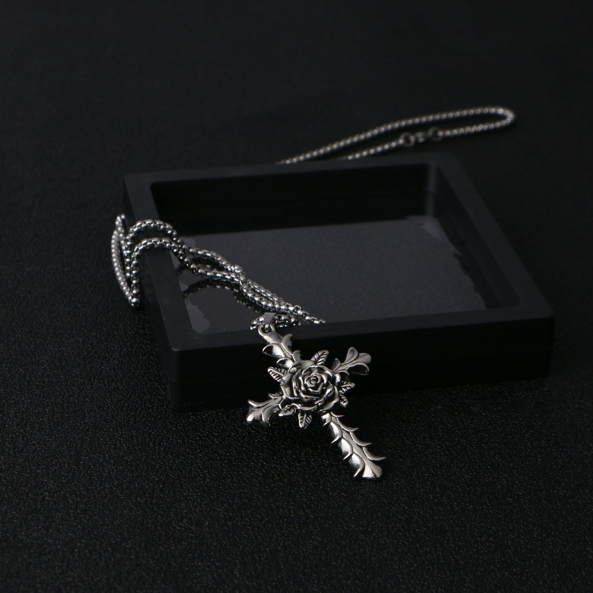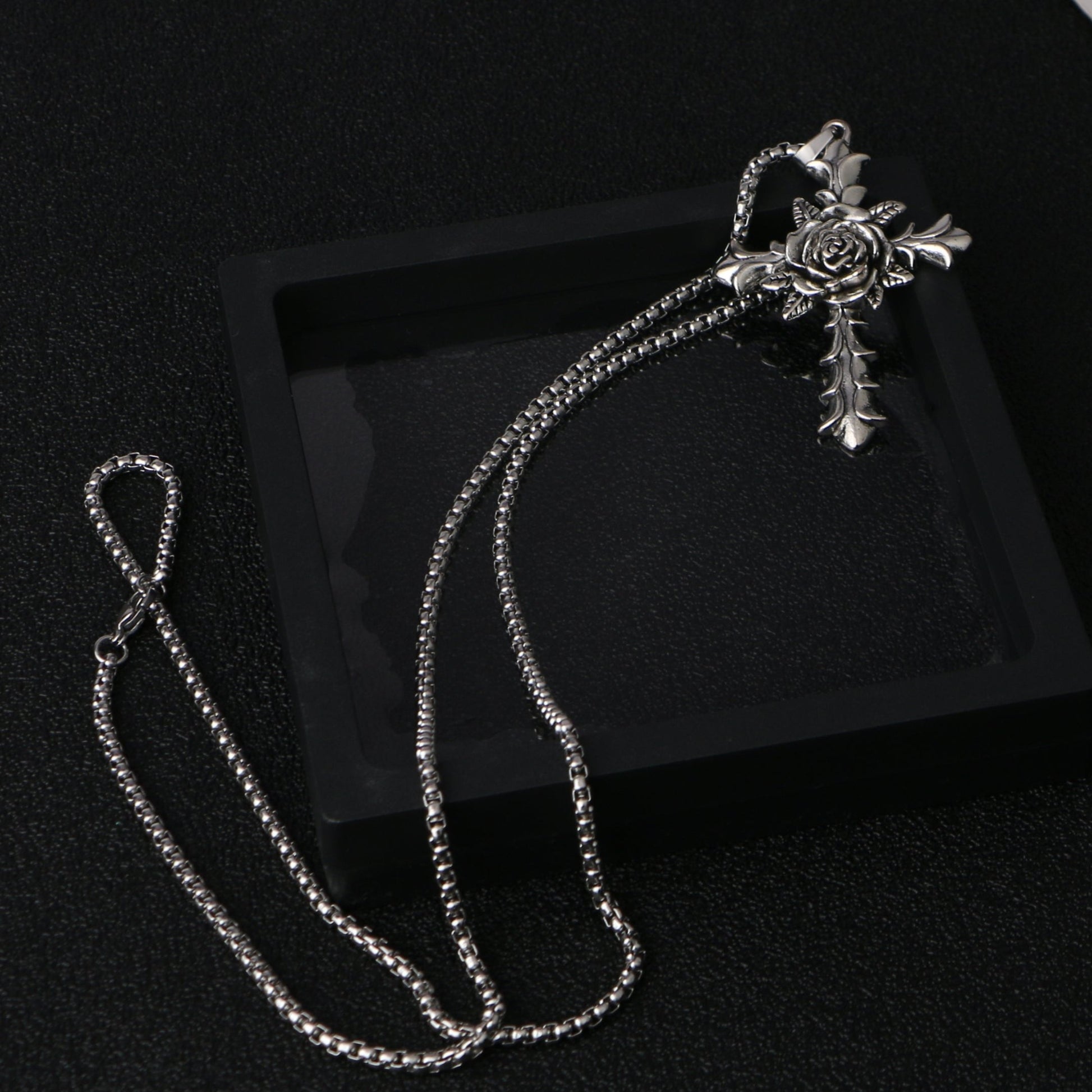 The Rose Thorn Cross Pendant is a captivating piece of jewelry that combines elegance and strength. Crafted from durable stainless steel, this necklace features a beautifully detailed rose at the center of a cross, with thorn-like accents extending outward, symbolizing the harmony of beauty and resilience. The intricate craftsmanship of the pendant is complemented by a robust chain, making it both stylish and durable for everyday wear. Length: 70 CM