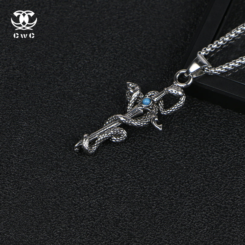 Embodying ancient mystique and symbolic strength, the Serpent of Wisdom Pendant features a detailed serpent coiled around a sword-like staff, crowned with a striking blue gemstone at its center. Forged from durable titanium steel, this pendant represents transformation, protection, and hidden knowledge—echoing the timeless power of myth and alchemy. Length: 70 cm