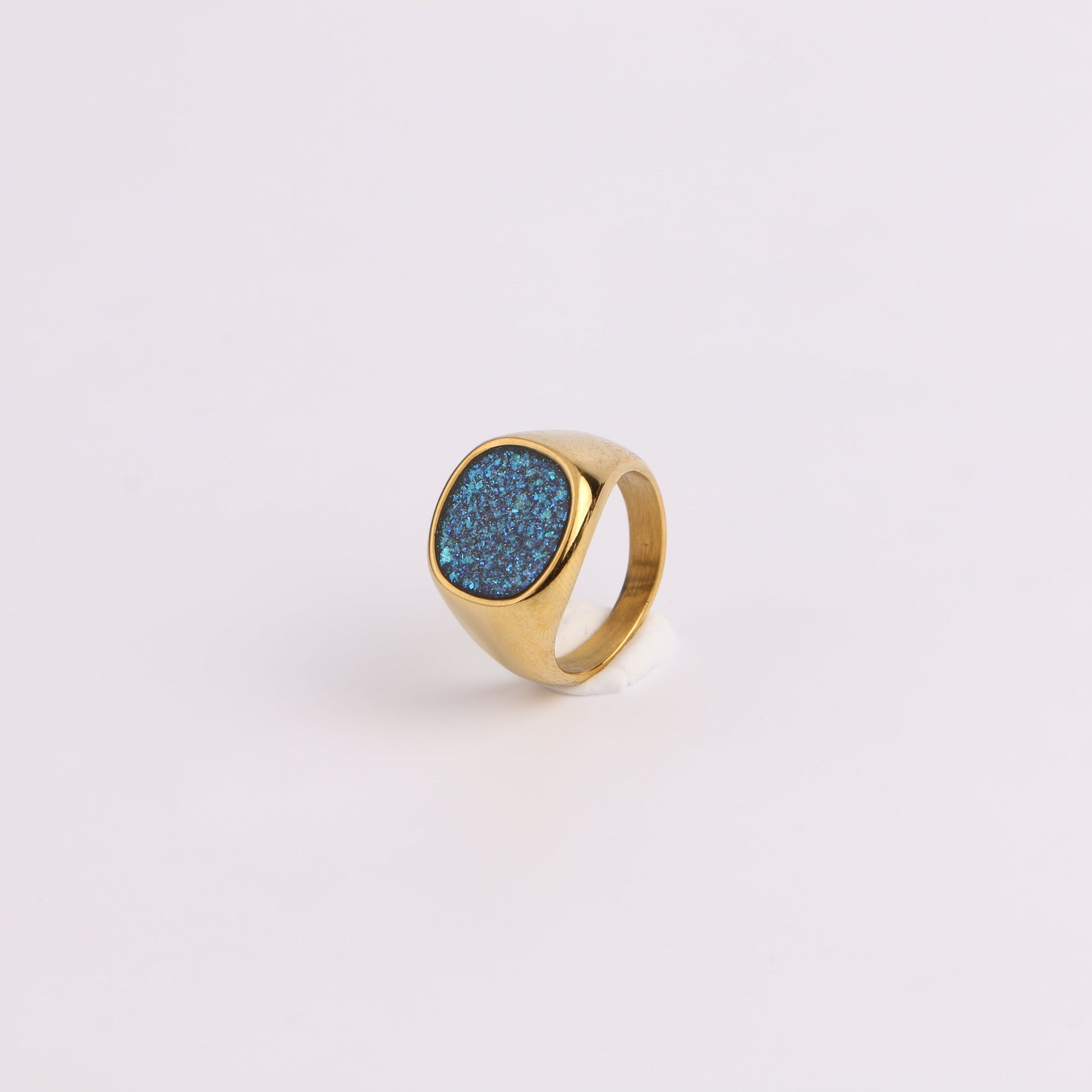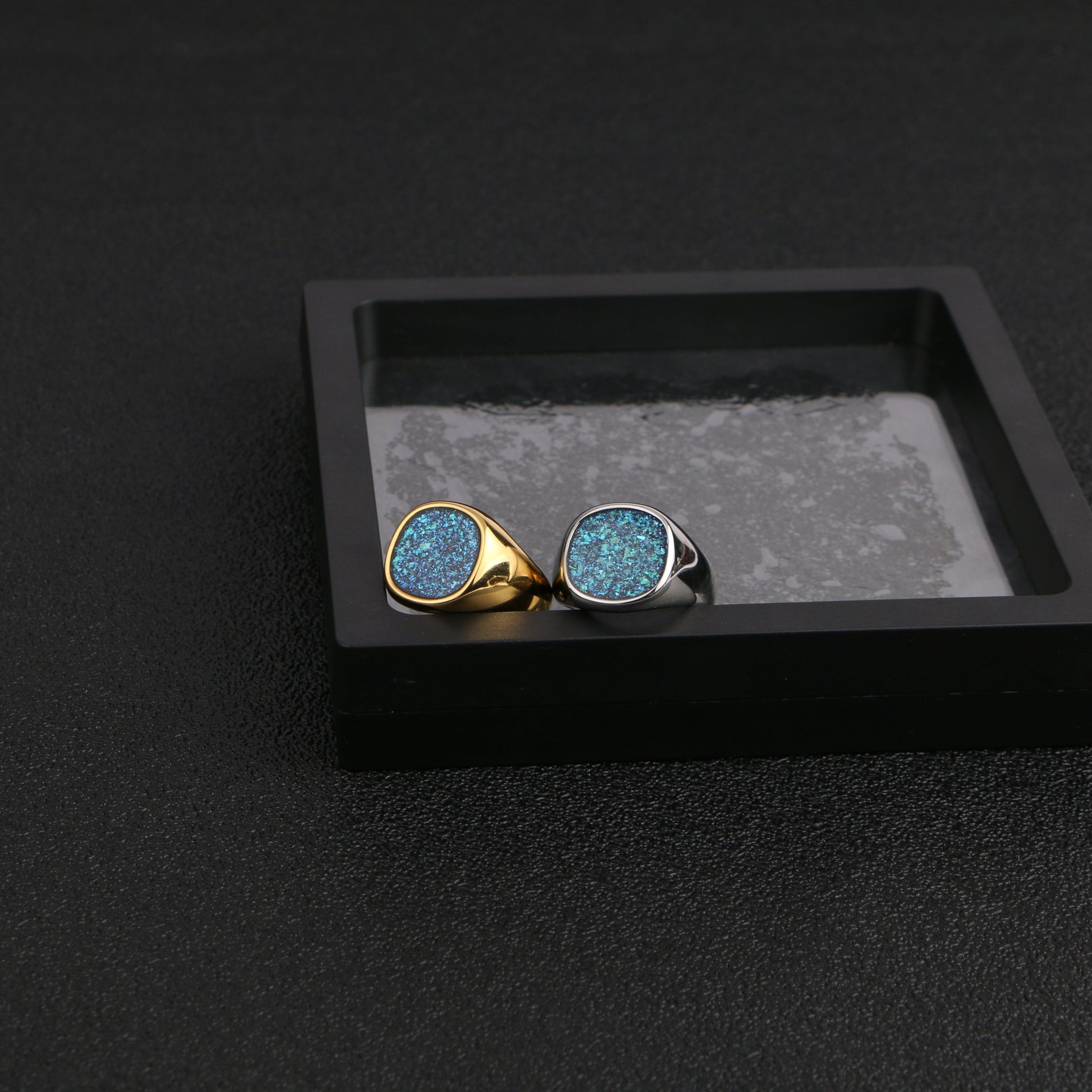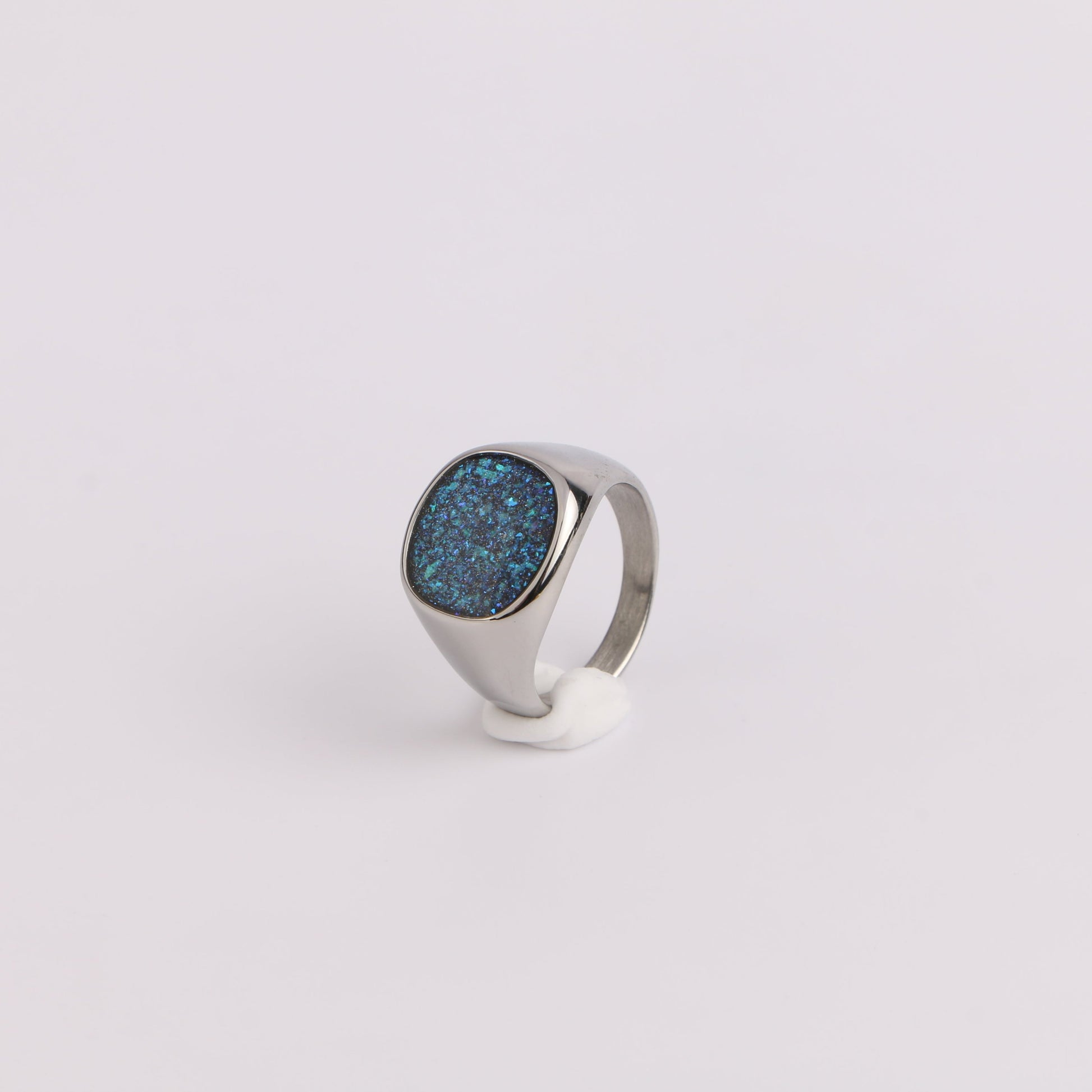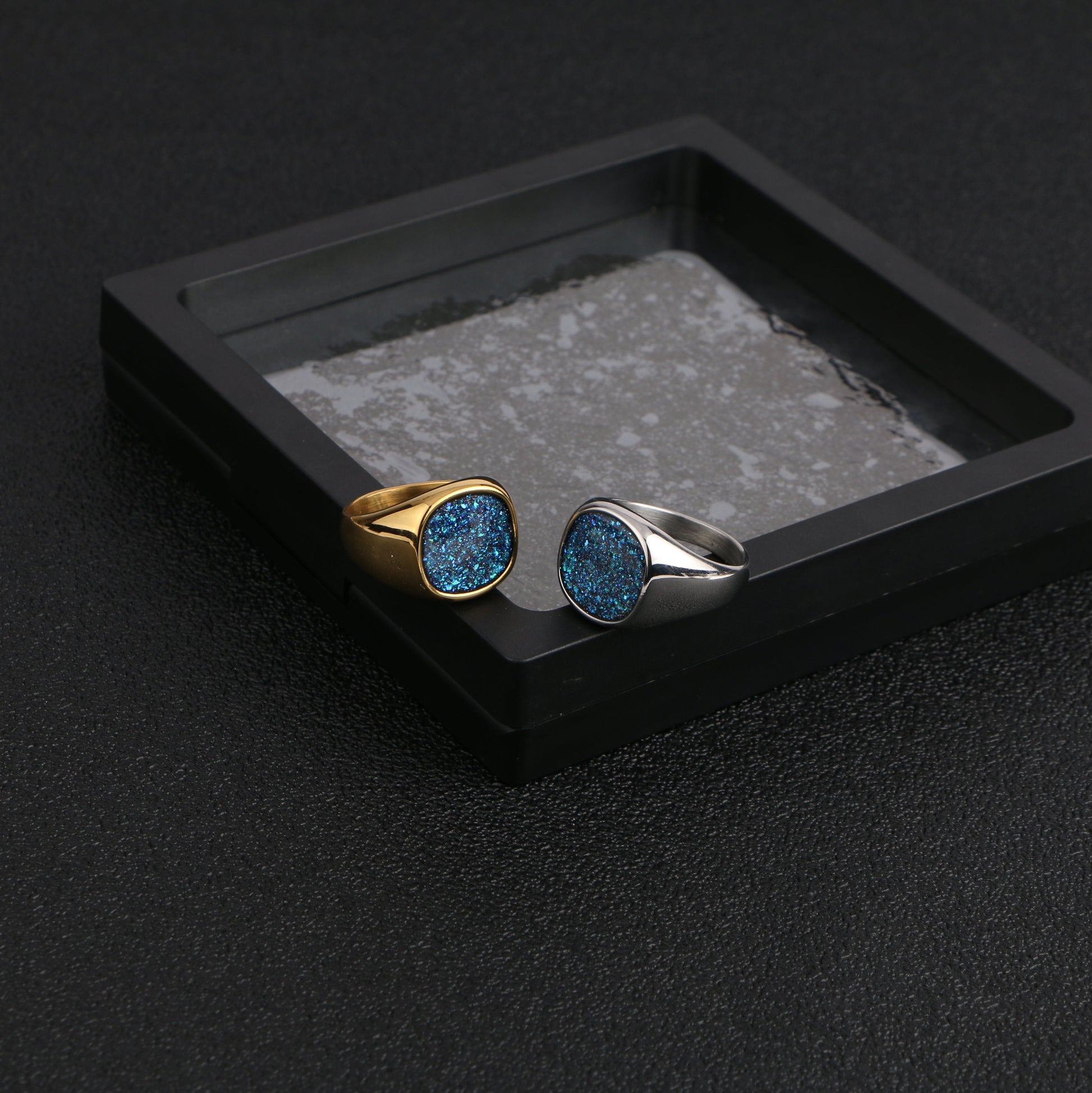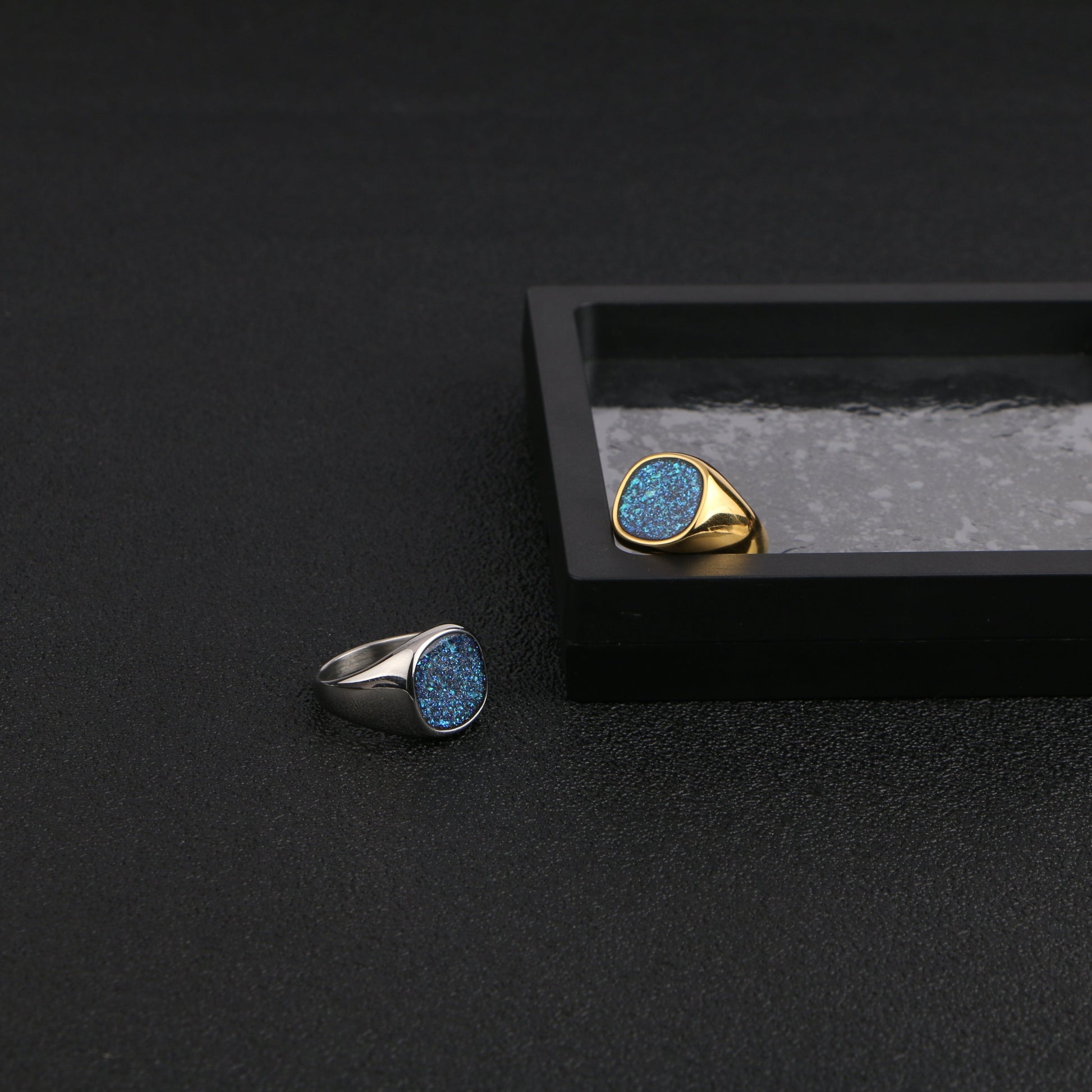 An eye-catching piece crafted from premium titanium steel. This ring features a dazzling blue glittery face set in a smooth, polished band, creating a striking contrast that captures attention. Available in both sleek silver and luxurious gold finishes, the Starlight Sparkle Ring offers versatility to match your personal style. The titanium steel construction ensures exceptional durability and resistance to tarnish, making it ideal for everyday wear.
