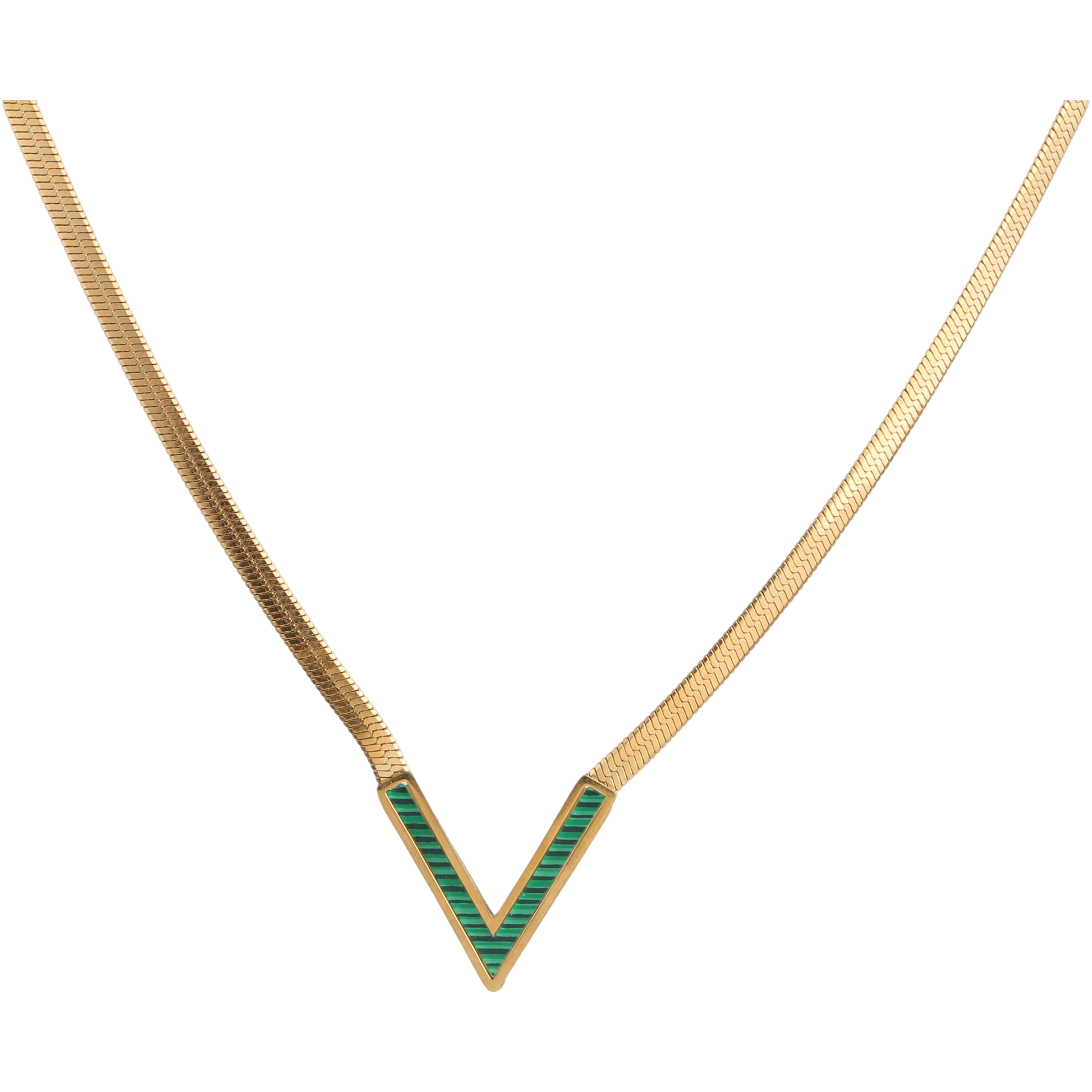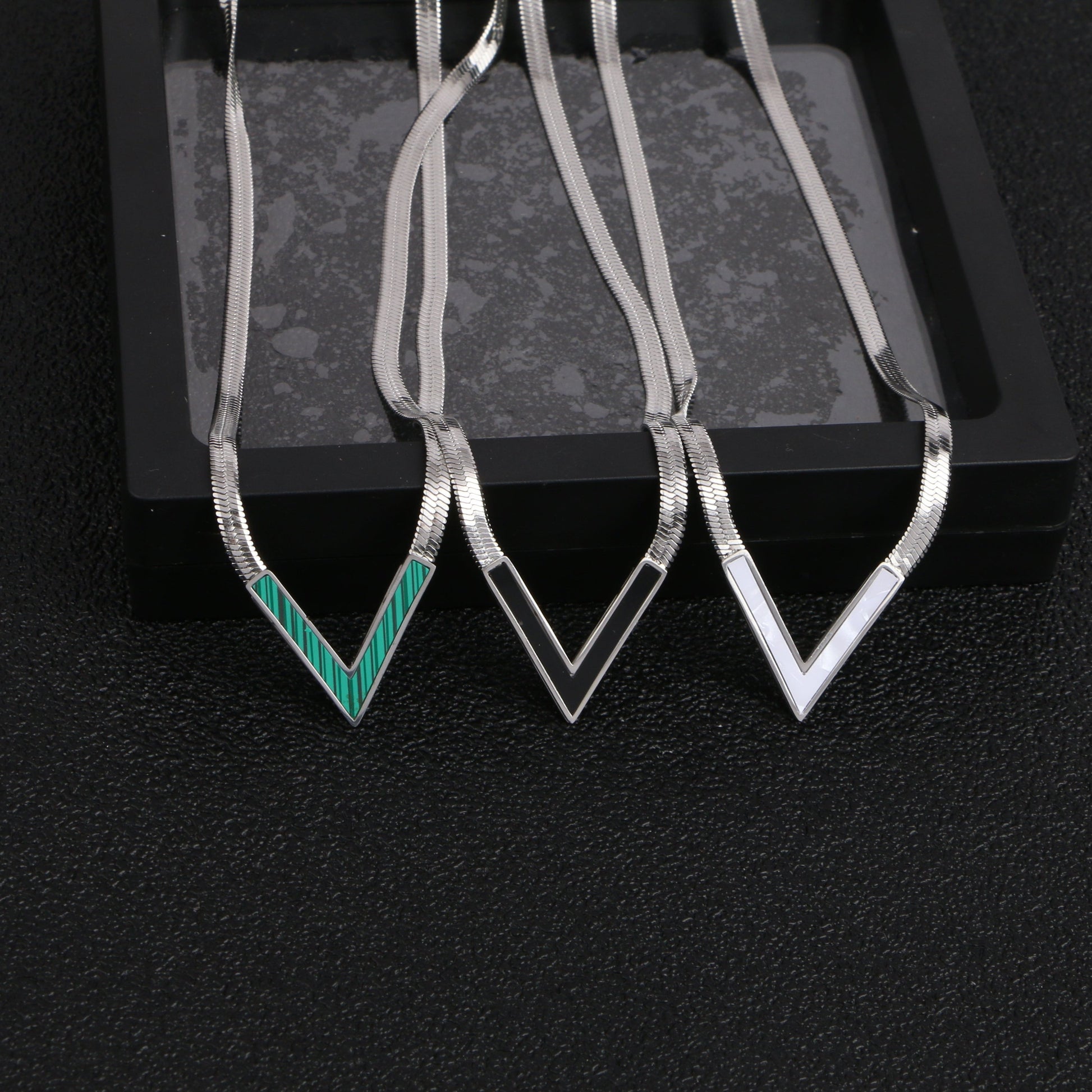A bold and modern accessory crafted from premium titanium steel. This necklace features a sleek V-shaped pendant available in three distinct inlays—rich green, classic black, and elegant white—each adding a unique touch to the design. The gold-tone chain enhances the necklace's sophisticated appeal, making it perfect for both casual and formal occasions. Length: 45 CM